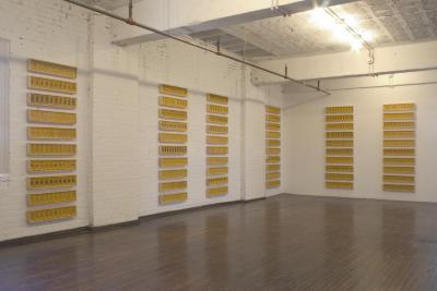 Delgado continues to create work based on his incarceration in the early 1990s, where he began carving soap that was readily available. This installation is made up of 1,000 bars of soap inlaid with mundane objects, such as keys, pins and clamps. Wooden boxes enclose each series of ten similar objects, creating a room-sized display. The multiple soap bars fill the room with the heady scent of citronella.