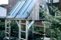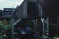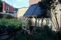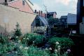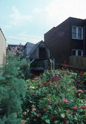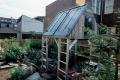 The compact shelter constructed of discarded materials sits in an inner city garden, lush with flowers and foliage behind a plain wooden fence. Four chair backs, made from aluminum ladders, hold up a pitched roof consisting of two doors in a wooden frame. Between the chairs is a pup tent which doubles as a table base. Climbing one of the ladders up into the attic-room, you find rubber tires fastened closely together to form a hammock.