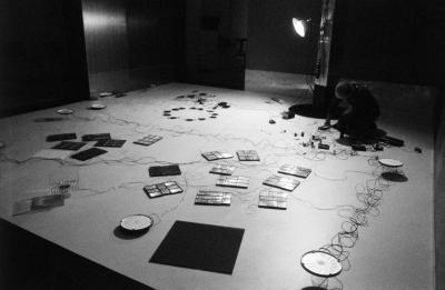 In an intimate performance on the fifth floor at 500 Sampsonia Way, sunlight fell through the windows onto solar panels scattered on the floor that powered tape players. Moving his hands across the solar panels, Julius manipulated the recording, modulating the sounds by interrupting the power source. Speakers, sometimes covered with paper and sticks, vibrated as they played.