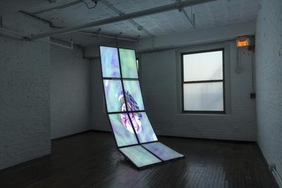 Metadata is a video compilation of various montages, frames, and long takes with musical arrangement by electronic composer Elise Macmillan. Resonating absences, but also brute police forces, this video contains clips from protests, scenes from 3D modeling environments, and drone scapes. These videos are networked across multiple screens that have been sculpturally shaped into a tall arch, asserting its physical presence like boding force. Embedded within one of the video sections is a poem the artist wrote about the ties the police have to slave catchers who then became police officers after abolition. The video also separately speaks to the artist's own personal loss, affecting the video with an additional elegiac quality of the search for a missing friend. This personal grief is then linked to a more general lament for the continual domestic warfare within the United States, revealing a larger problem within legalities, which persists not to be rectified. -Vanessa Gravenor