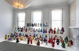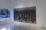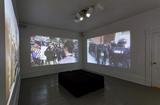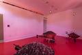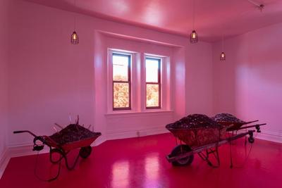 found objects/wheelbarrow sculptures, red floor, ticker tape, sound installation