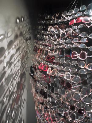 Robin Stanaway here moves from being a glass artist to an artist exploring the effects achieved by glass lenses in this case some hundreds of spectacles donated for the purposes of this exhibition. Light passes through them to some effect, but looking through the arranged ranks of lenses also alters the viewers’ perceptions. Such discarded spectacles also evoke imprinted memories of past owners.