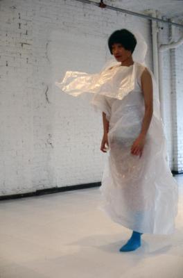 This piece has 3 parts at different sites, first with Akio Suzuki, second with Hans Peter Kuhn, third with Rolf Julius. These sound artists who were all invited here to the Mattress Factory are also my most important collaborators. Since the three sound pieces are very different, my dances and also my costumes will correspondingly vary. The mood of each dance is related to the actual piece. Although their works are different, for me the three artists have some sort of similarity in their basic concept. That is my bridge between the dances.