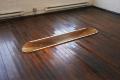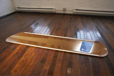 The space of display—the museum gallery—is transformed from a container for specific objects into a lensed view of the outside world. The fourth floor gallery floor and the third floor window are part of the work. The shaped hole in the interior floor extends through the armature, framing a vista out the side of the building. In this way, Oppenheimer has created a zone for pictorial reflection. The view of the outside world is framed and is accepted as the work.