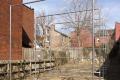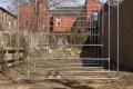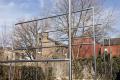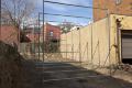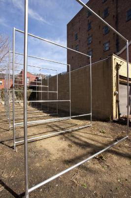 7 increments, is outside of the gallery spaces. It takes the form of a large sculptural intervention that is located in a vacant parking lot at 510 Sampsonia Way. This work is made from the type of galvanized steel sections typically used to construct urban fencing. The work consists of seven independent square units each measuring 12 ft by 12 ft set equidistant in a straight line. Burke employs these modular forms to frame the environment they inhabit. Acting like a form of tunnel, its vertical lines and physical scale dissect its surrounding buildings, trees and sky. This configuration and its deliberate use of scale dwarfs the viewer, encouraging them to re-access their personal physicality and relationship with the objects that surround them.