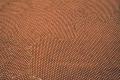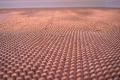 Judith Schumacher is a sculptor. In a single room she has arduously and meticulously placed 983,000 small brass beads so as to cover the entire (and uneven) floor of the space. The unevenness prevents the perfect packing that physicists could predict as ideal; instead a form of chaos theory intervenes, complicating even further the obsessional and time-based quality of the work. Brass bearings of this kind are essential ingredients of landmines and other explosive devices.