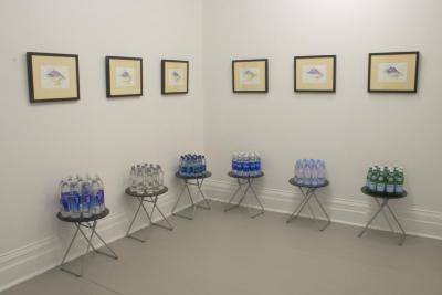 A 19th century English watercolor from a local corporate collection is the basis for a group of studies of a detail found in the painting. Water, the pure, limpid medium of this refined art-form, has been rediscovered today as a fashionable, even refined, beverage. The artist ironically tests a range of modern designer waters (Evian, Glacéau Smartwater, San Pellegrino, Tŷ Nant, Aquafina, and Dasani) as the solvent in his watercolor studies and invites the viewer to taste (or at least to commit an act of taste) and see.