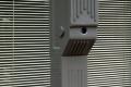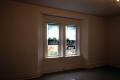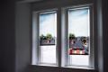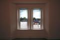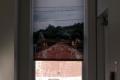There are three windows with pull blinds made of transparencies. Each is a photograph of the actual scene outside the window, taken on a beautiful sunny day. The three shades are kept partially pulled, each set to a different height. The scene may line up perfectly with the outside view, or it may not, depending upon one's height.